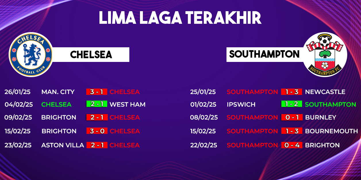 Sementara itu, Southampton harus bekerja ekstra keras jika ingin membawa pulang hasil positif dari Stamford Bridge. Dengan performa yang jauh dari kata ideal, The Saints wajib menemukan cara untuk memperbaiki lini pertahanan mereka yang kerap kebobolan dalam jumlah besar.